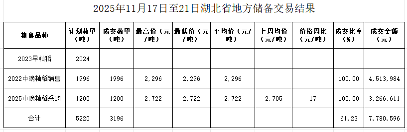 本周湖北地储成交各类粮油3196吨。其中销售:2022年中晚籼稻1996吨,成交率100%,成交均价2296元/吨。采购:2025年中晚籼稻1200吨,成交率100%,成交均价2722/吨,环比上涨17元/吨