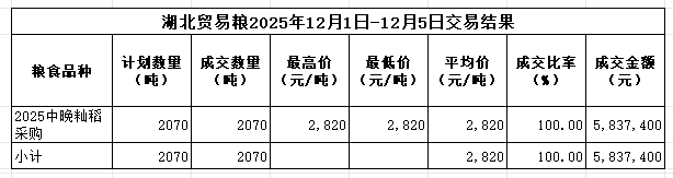 本周湖北贸易粮交易采购成交2070吨2025年中晚籼稻,成交率100%,成交均价2820元/吨