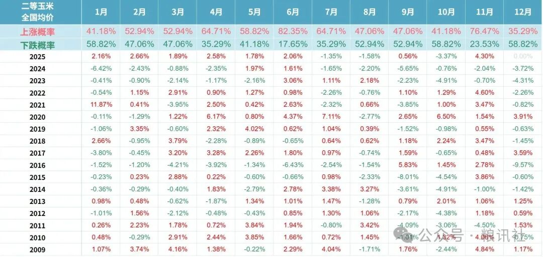9-10月:上涨概率维持47.06%,10月下跌概率升至58.82%,但2025年10月仅跌3.37%——新粮集中上市高峰,但华北毒素超标粮源被剔除流通,实际有效供给未显著增加。